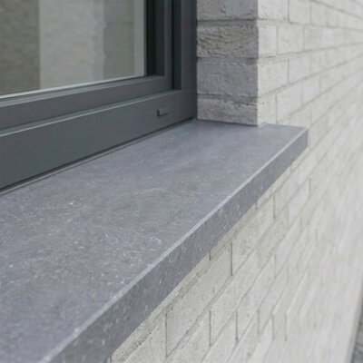 Eine schöne blaugraue (Belgian Blue) Fensterbank außen (Sohlbank mit Wassernase / Tropfkante) - 2 cm stark - mit einem stilvollen & edlen Look, gefertigt aus hochwertigem belgischem Blaustein leicht geschliffen. Lesen Sie mehr