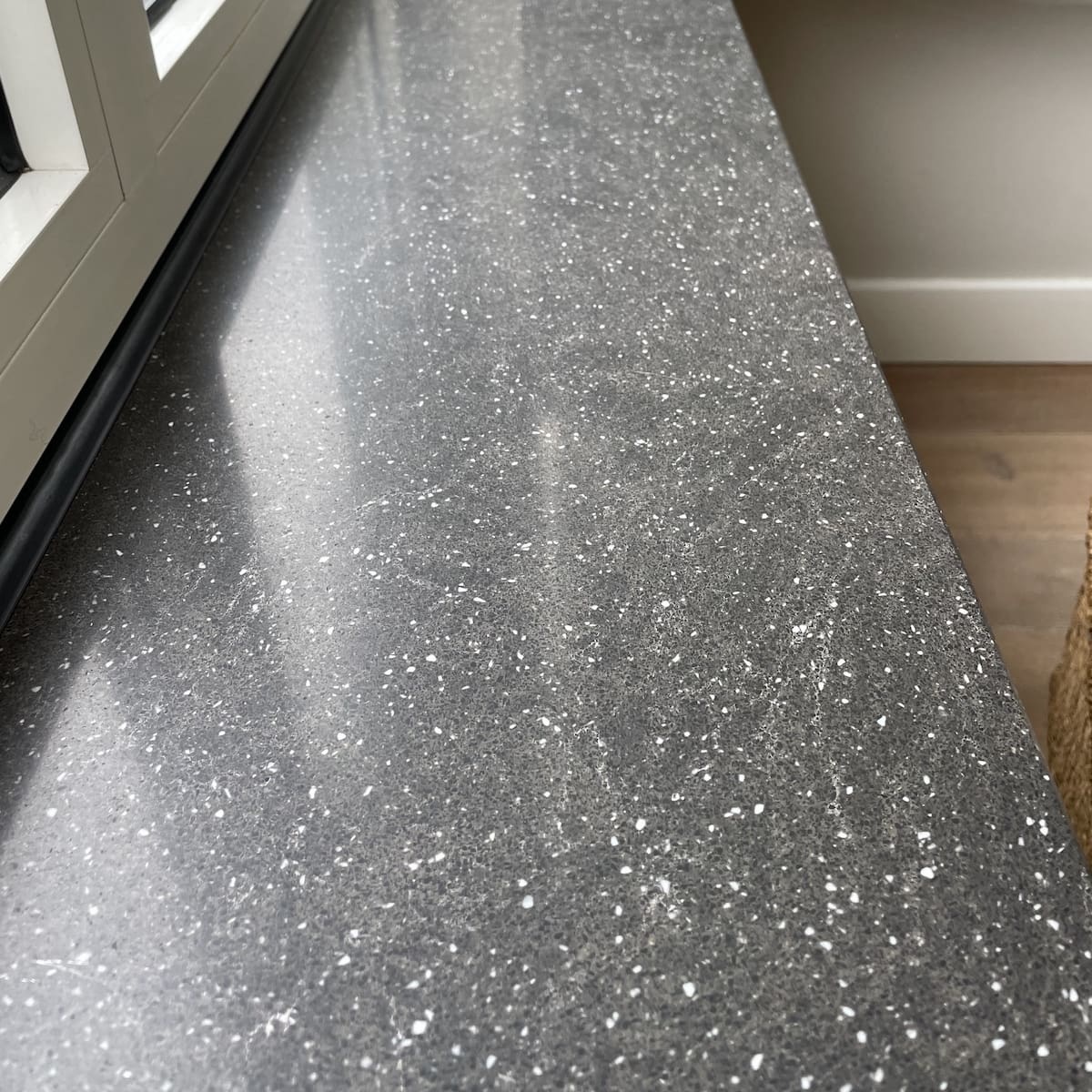 Fensterbank innen - Marmorkomposit poliert - Blaustein Optik (dunkel) - 3 cm stark - Breite: 10-50 cm - Länge: 10-200 cm - nach Maß gefertigt - Innenfensterbänke (Fenstersims) Kunststein / Komposit (Verbundwerkstoff) - Agglo Marmor / Gussmarmor. Eine schöne Blaustein Optik (dunkel) Fensterbank aus Kunststein für den Innenbereich mit einem stilvollen Look, gefertigt aus edlem Gussmarmor. Die Agglo Marmor mit der „Blaustein“ Dunkel“ geschliffen Optik Fensterbank ist eine lebendige & „robuste“ Innenfensterbank mit einer naturnahen dunkel Blaustein-Optik (dunkel geschliffen/ feingeschliffen). Während der „echte“, dunkel geschliffene belgische Blaustein eine etwas gröbere Marmorierung aufweisen kann, ist die Blaustein-Look-Farbe dieses Kunststein-Fenstersimses etwas ruhiger, weicher und wirkt auch etwas „ebenmäßiger“. Ein schöner Anthrazit-Farbton mit Blaustein-Optik-Marmorierungen, der die schöne Optik von dunkel Blaustein mit dem optimalen Preis-Leistungs-Verhältnis (und anderen Vorteilen) von Agglo-Marmor (Marmor-Verbund) verbindet. Die attraktive Fensterbank innen aus Marmorkomposit Kunststein in der Farbe Blaustein-Look-Anthrazit kombiniert eine ansprechende Grundfarbe mit dezenten Marmorierungen. Sie passt - von klassisch bis modern - zu fast jedem Einrichtungsstil und ist eine der beliebtesten „Komposit-Farben“ Deutschlands.