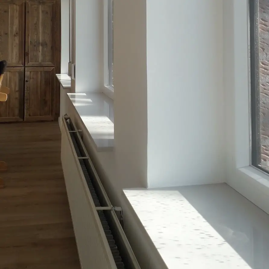 Eine schöne weiße Fensterbank für den Innenbereich mit einem modernen & minimalistischen Look, gefertigt aus edlem Gussmarmor. Ein besonderer Weißton mit sehr leichten Nuance in der Oberfläche. Lesen Sie mehr