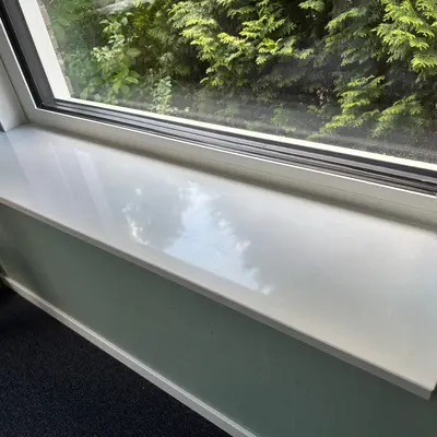 Eine schöne weiße Fensterbank für den Innenbereich mit einem modernen & minimalistischen Look, gefertigt aus edlem Gussmarmor. Ein besonderer Weißton mit sehr leichten Nuance in der Oberfläche. Lesen Sie mehr