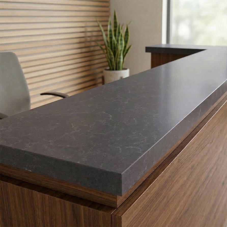 Platte innen - Quarz-Komposit poliert - Marmor Optik Grau - 2 cm stark - Breite: 10-60 cm - Länge: 10-200 cm - Nach Maß gefertigt - Kunststeinplatte / Arbeitsplatte Kunststein - Komposit (verbundwerkstoff) - Quarzkomposit / Quarzverbund. Eine schöne graue Marmor Optik Kunststein Arbeitsplatte für den Innenbereich mit einem stilvollen Look, gefertigt aus hochwertigem Quarz-Komposit. Eine schöne dunkelgraue Marmor-Optik Kunststeinplatte mit einer graphitgrauen Grundfarbe kombiniert mit schönen & dezenten hellen Marmor-Look-Zeichnungen und Akzenten. Ein schöner Quarz-Komposit-Farbton, der ein elegantes & stilvolles Aussehen mit einem weichen & ruhigen Marmor-Look kombiniert. Eine dunkelgraue Marmor Optik Arbeitsplatte passt sehr gut zu diversen Einrichtungsstilen: Von einem modernen & schlichten (minimalistischen) Design bis hin zu einem traditionellen, klassischen Styling.