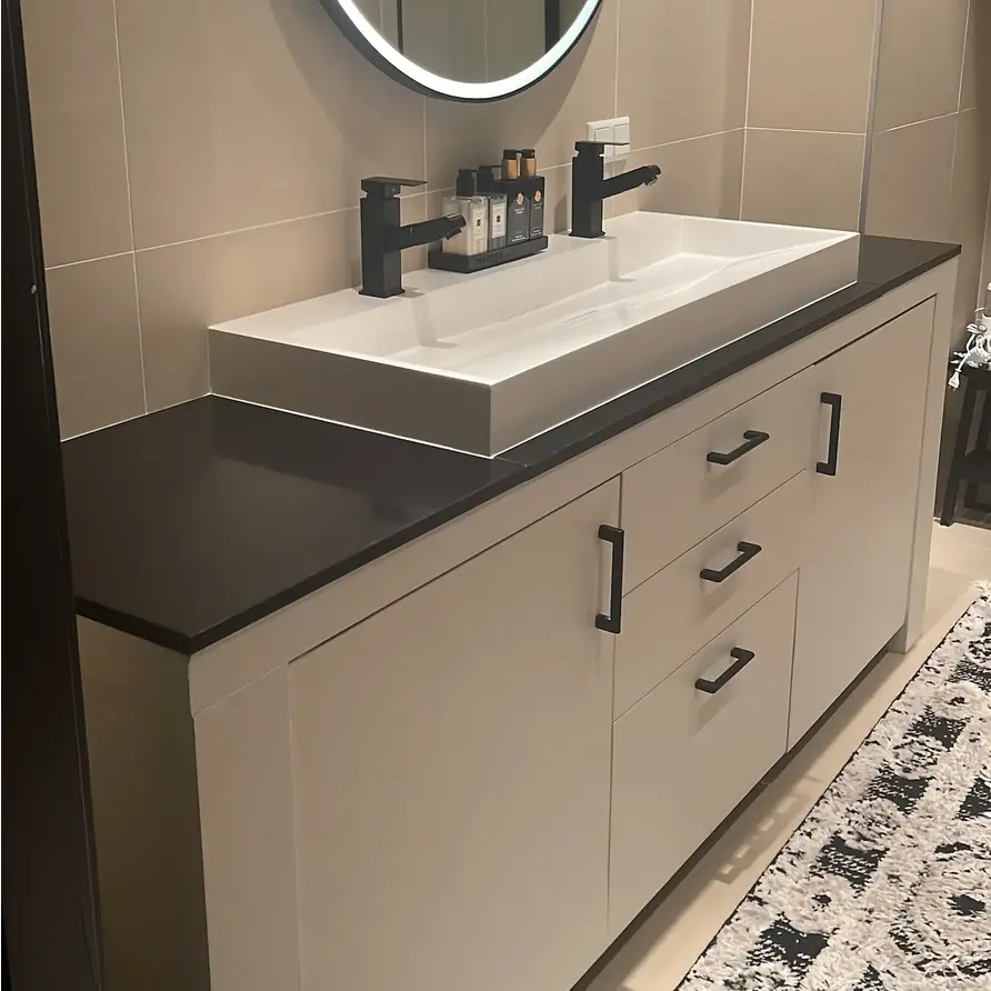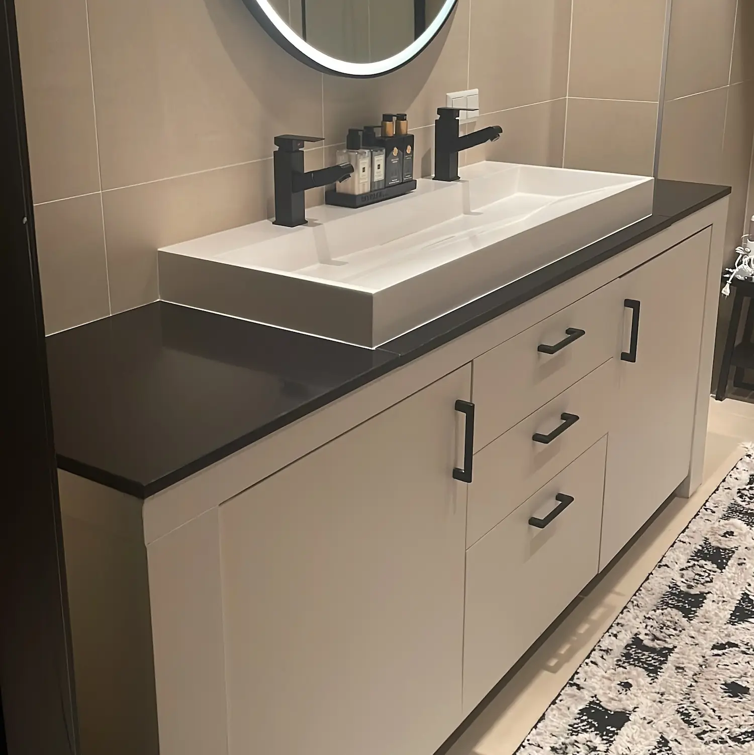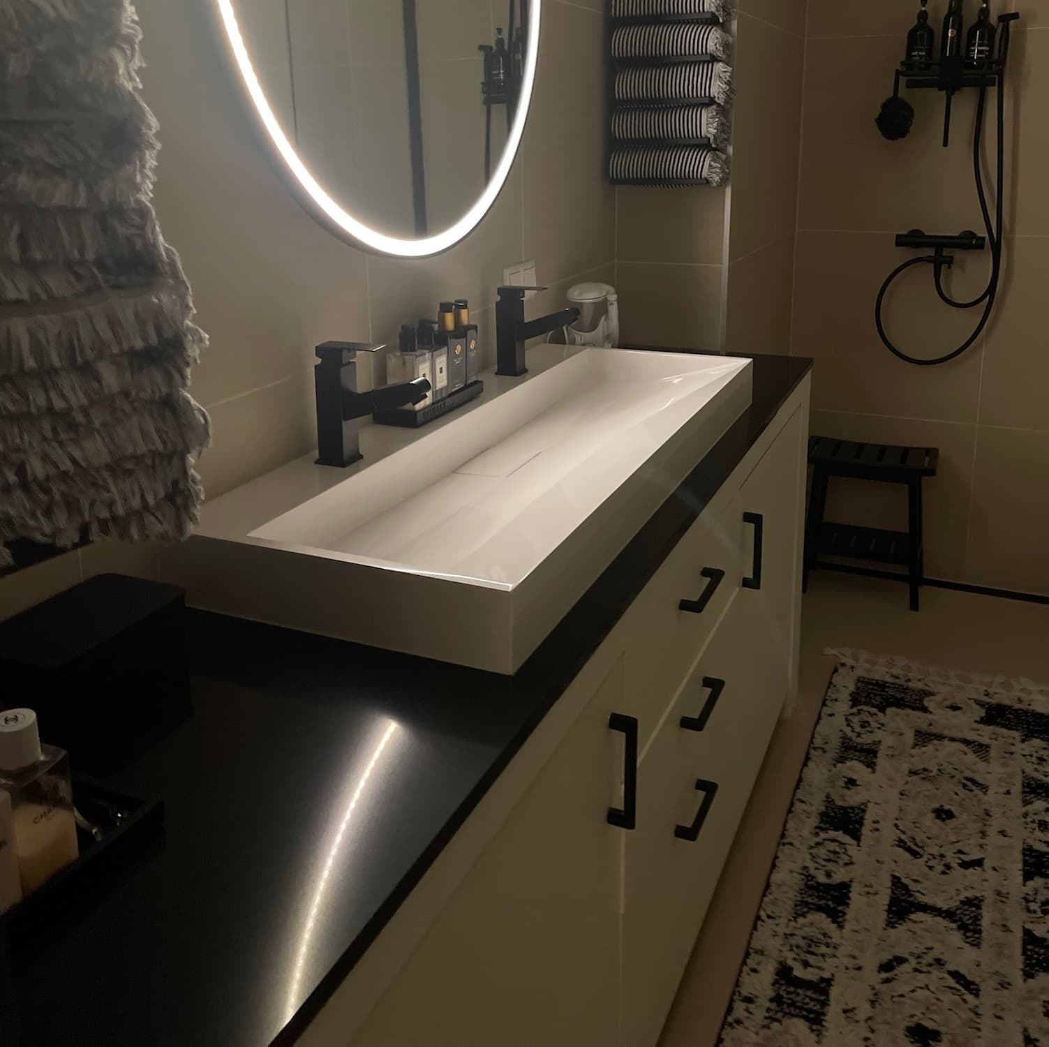 Diese Platte / Arbeitsplatte aus Quarz-Komposit wird für Sie in unserem eigenen Naturstein-Sägewerk von erfahrenen Handwerkern mit Sorgfalt & Liebe zum Beruf - millimetergenau - auf Maß geschnitten & bearbeitet. Standardmäßig wird Ihre Kunststeinplatte „gerade geschnitten“. Außerdem werden die Frontseite und beide Seitenflächen bearbeitet, d. h. poliert und mit einer gefasten Kante versehen. Diese wunderschöne Topqualität der „Steinplatte“ eignet sich idealerweise für den modernen & schlichten Einrichtungsstil.