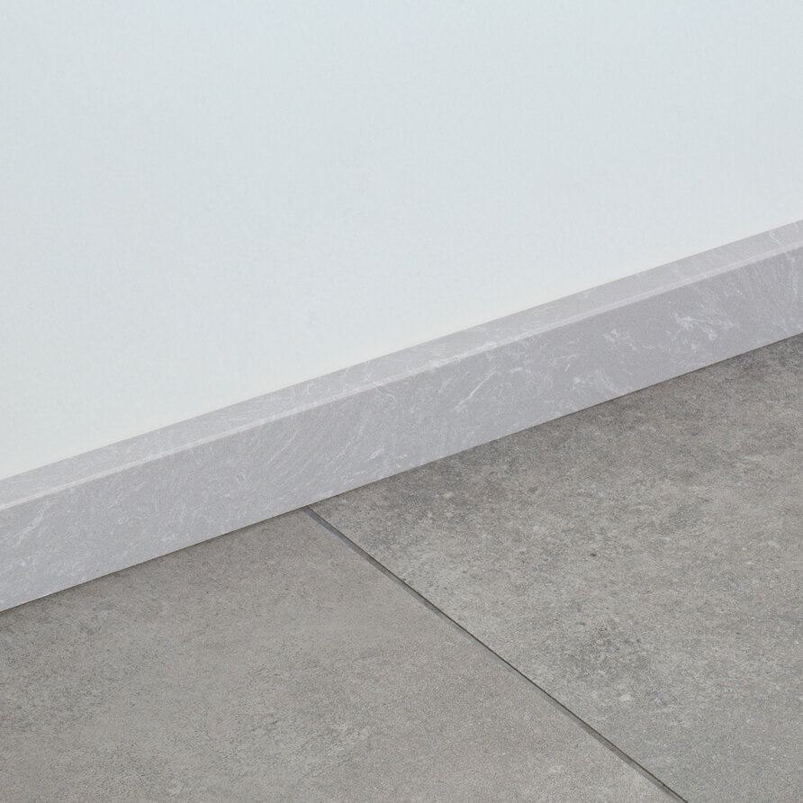 Eine schöne hellgraue Fußleiste in Marmor-Optik für den Innenbereich, gefertigt aus edlem Gussmarmor. Ein typischer "Passt-zu-allem"-Farbton mit mit ruhigen und wolkigen (weißlichen) Natursteinzeichnungen; stilvoll und vielseitig einsetzbar! Lesen Sie mehr