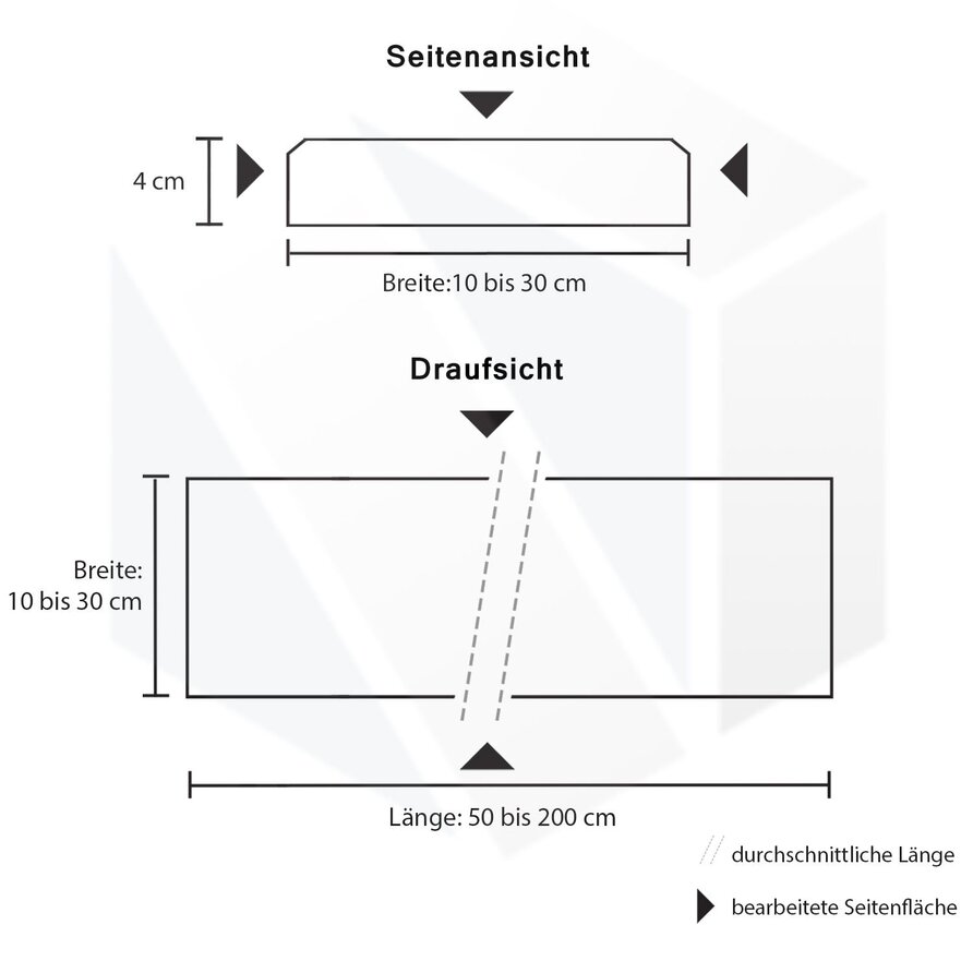 Diese Naturstein-Türschwelle wird für Sie in unserem eigenen Naturstein-Sägewerk von erfahrenen Handwerkern mit Sorgfalt & Liebe zum Beruf - millimetergenau - auf Maß geschnitten & bearbeitet. Standardmäßig wird Ihre Haustürschwelle „gerade geschnitten“. Neben der Oberseite werden die Vorderseite + Rückseite (also die beiden langen Seitenflächen) vollständig bearbeitet, d. h. grob geschliffen + mit einer gefasten Kante versehen. Bitte beachten Sie, dass die „Kopfseiten“ einer Aussentürschwelle standardmäßig nicht bearbeitet sind.