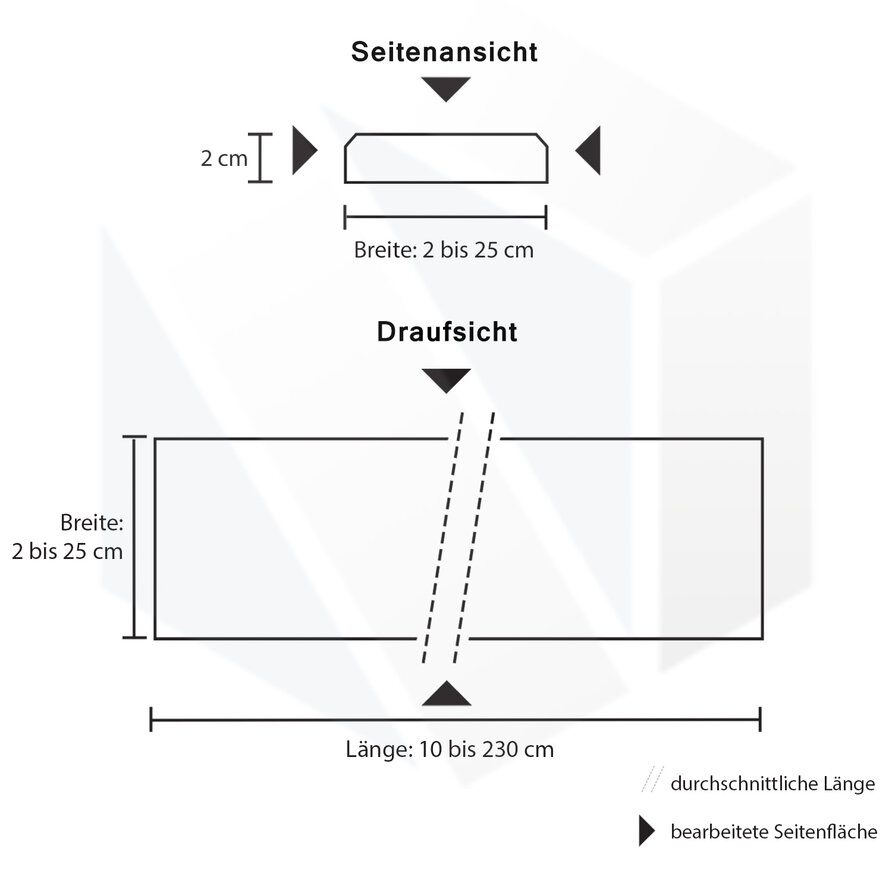 | Größe | Dicke: 2 cm - Breite: 2 - 25 cm - Länge: 10 - 200 cm |