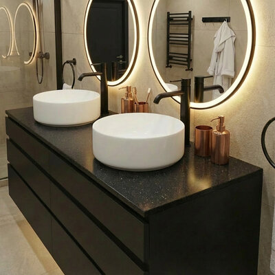 Eine schöne schwarze Waschtischplatte (für Aufsatzwaschbecken) mit einem modernen Look, gefertigt aus hochwertigem Quarz Komposit Kunststein. Schwarz Sprenkel ist eine spezielle Schwarznuance, die einen subtilen „Sprenkel“-Akzent in der Oberfläche aufweis Lesen Sie mehr